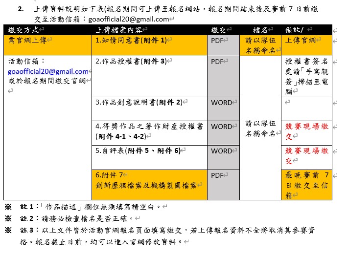 賽前7天繳交至信箱 (期限:11/8晚上12點前) 信箱: goaofficial20@gmail.com