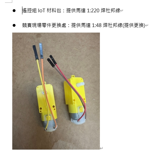 最新消息 【PT】遙控組及IOT 2025/10/20 思頂機器人114.10.20更新 IOT機構材料包中馬達及電線-如圖所示 競賽中除使用思頂開發之APP「思頂機器人控制器」, 開放隊伍可自行開發 APP 或自製遙控器 (控制晶片仍然須使用官方指定晶片) 控制機器人(三分高手、清道達人、食球怪獸、IOT手臂車), 自製遙控器操控方式需與官方APP上的操作模式相同(2顆按鈕控制1顆馬達正反轉,共8顆按鈕控制4顆馬達) 適用賽事: 20205新北市賽 2025年全國賽 回上頁 回最上方